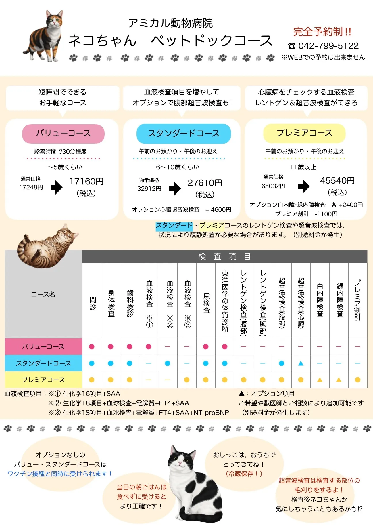 私どもの病院に来てくれるワンちゃん、ネコちゃんが、みな健康で長生きしてもらいたい。この思いを形にするため、個々に合わせて3コースから選べるペットドック(完全予約制)を実施しています。ガンや慢性病は飼い主さんでは気付きにくく、症状が出てからでは手遅れになるケースもあります。また、身体検診や血液検診だけでは見つからない病気もあり、レントゲン検診や超音波検診など総合的な検診が必要です。健康なうちから定期的に検診をうけることで、病気の早期発見、早期治療の可能性が高まります。若齢、高齢の子までペットドックをぜひご利用ください。